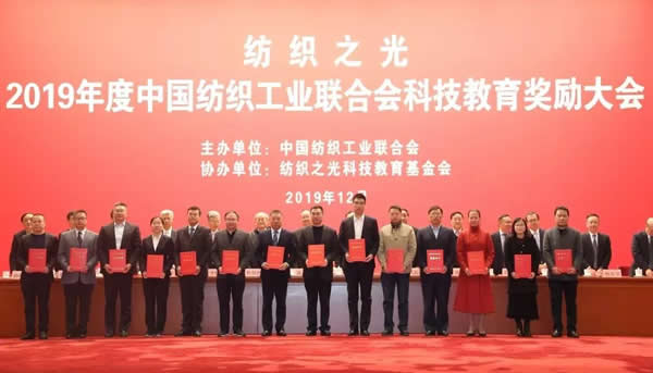 12月6日,在人民大会堂举行的“纺织之光”2019年度中国纺织工业联合会科技教育奖励大会,发布并表彰“纺织之光”2019年度中国纺织工业联合会科学技术奖、教育教学成果奖、教师奖、学生奖、针织内衣创新贡献奖、全国纺织行业技术能手,通报表扬全国纺织行业技能人才培育突出贡献奖单位,发布并表彰中国纺织行业专利奖,对2019年度纺织行业重点实验室、纺织技术创新中心授牌。
